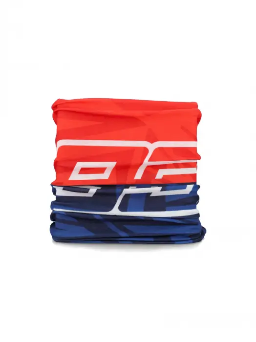 Braga de cuello de la colección oficial del piloto Marc Marquez. Base azul y roja con estampado gráfico y detalle del número del campeón español. Composición: 100% poliéster